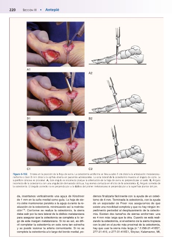 la osteotomía. El ángulo correcto no es perpendicular a la diáfisis del primer metatarsiano ni perpendicular a la superficie plantar del pie.