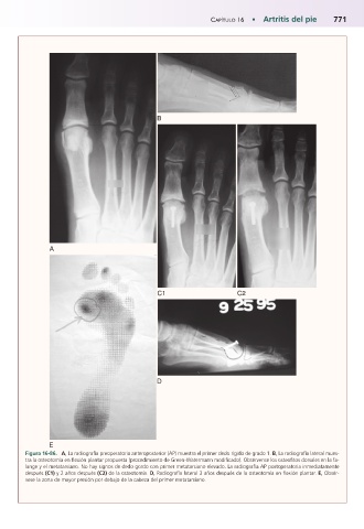 después (C1) y 2 años después (C2) de la osteotomía. D, Radiografía lateral 3 años después de la osteotomía en flexión plantar. E, Obsér-
