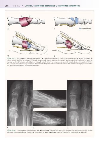 hueso marca la resección (se extirpa el 25% de la longitud de la falange proximal). Se realiza la queilectomía dorsal. C, Se liberan proximal-
