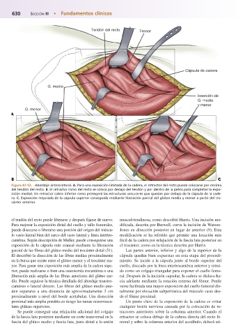 Figura 47-12.mAbordaje anterolateral. A. Para una exposición limitada de la cadera, el retractor del recto puede colocarse por encima