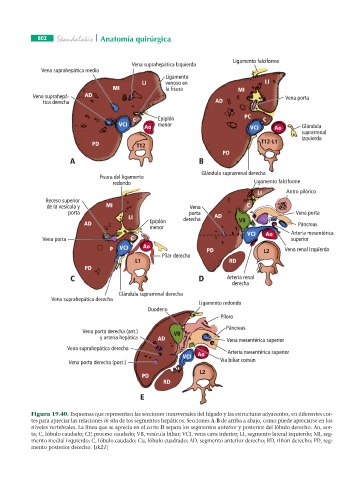 Figura 19.40. Esquemas que representan las secciones transversales del hígado y las estructuras adyacentes, en diferentes cor-