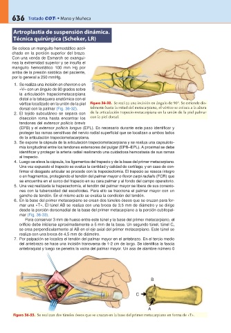 Figura 36-33. Se realizan dos túneles óseos que se cruzan en la base del primer metacarpiano en forma de «T».