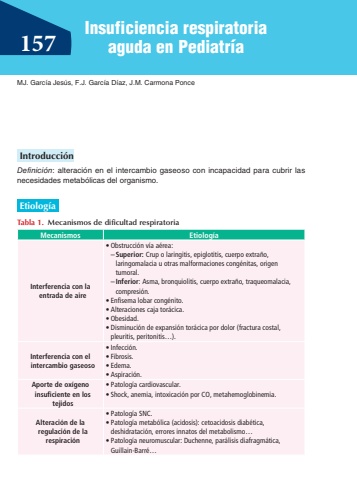 Insuficiencia respiratoria 157aguda en Pediatr%u00edaMJ. Garc%u00eda Jes%u00fas, F.J. Garc%u00eda D%u00edaz, J.M. Carmona PonceIntroducci%u00f3nDefinici%u00f3n: alteraci%u00f3n en el intercambio gaseoso con incapacidad para cubrir las necesidades metab%u00f3licas del organismo.Etiolog%u00edaTabla 1.Mecanismos de dificultad respiratoriaMecanismos Etiolog%u00edaInterferencia con la entrada de aire%u2022Obstrucci%u00f3n v%u00eda a%u00e9rea:%u2013Superior: Crup o laringitis, epiglotitis, cuerpo extra%u00f1o, laringomalacia u otras malformaciones cong%u00e9nitas, origen tumoral.Inferior: Asma, bronquiolitis, cuerpo extra%u00f1o, traqueomalacia, compresi%u00f3n.%u2022Enfisema lobar cong%u00e9nito.%u2022Alteraciones caja tor%u00e1cica.%u2022Obesidad.%u2022Disminuci%u00f3n de expansi%u00f3n tor%u00e1cica por dolor (fractura costal, pleuritis, peritonitis%u2026).Interferencia con el intercambio gaseoso%u2022Infecci%u00f3n.%u2022Fibrosis.%u2022Edema.%u2022Aspiraci%u00f3n.Aporte de ox%u00edgeno insuficiente en los tejidos%u2022Patolog%u00eda cardiovascular.%u2022Shock, anemia, intoxicaci%u00f3n por CO, metahemoglobinemia.Alteraci%u00f3n de la regulaci%u00f3n de la respiraci%u00f3n%u2022Patolog%u00eda SNC.%u2022Patolog%u00eda metab%u00f3lica (acidosis): cetoacidosis diab%u00e9tica, deshidrataci%u00f3n, errores innatos del metabolismo%u2026%u2022Patolog%u00eda neuromuscular: Duchenne, par%u00e1lisis diafragm%u00e1tica, Guillain-Barr%u00e9%u2026