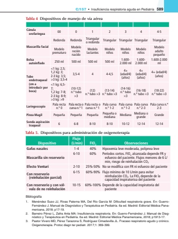 C/157%u2022Insuficiencia respiratoria aguda en Pediatr%u00eda589Bibliograf%u00eda1.Men%u00e9ndez Suso JJ, Rivas Paterna MA, Del R%u00edo Garc%u00eda M: Dificultad respiratoria grave. En: GuerroFern%u00e1ndez J. Manual de Diagn%u00f3stico y Terap%u00e9utica en Pediatr%u00eda. 6a ed. Madrid: Editorial M%u00e9dica Panamericana, 2018; p17-19.2.Barreiro P%u00e9rez L, Zafra Anta MA: Insuficiencia respiratoria. En: Guerro-Fern%u00e1ndez J. Manual de Diagn%u00f3stico y Terap%u00e9utica en Pediatr%u00eda. 6a ed. Madrid: Editorial M%u00e9dica Panamericana, 2018; p1913-17.3.Pastor Vivero MD, P%u00e9rez Tarazona S, Rodr%u00edguez Cimadevilla JL. Fracaso respiratorio agudo y cr%u00f3nico. Oxigenoterapia. Protoc diagn ter pediatr. 2017;1: 369-399.Tabla 4Dispositivos de manejo de v%u00eda a%u00e9reaC%u00e1nula orofar%u00edngea00012344-5Mascarilla facialRedondaRedondaTriangular o redondaTriangularTriangularTriangularTriangularModelo prematuroModelo reci%u00e9n nacidoModelo lactantesModelo ni%u00f1osModelo ni%u00f1osModelo ni%u00f1osModelo adulto peque%u00f1oBolsa autoinflado250 ml500 ml500 ml500 ml1.600-2.000 ml1.600-2.000 ml1.600-2.000 mlTubo endotraqueal (cm a introducir por boca)<1 kg: 2,5; 1,2 kg: 3; 2-3 kg: 3,5; >3 kg: 3,5-43,5-444-4,54+ (edad/4) (a%u00f1os)4+ (edad/4) (a%u00f1os)4+ (edad/4) (a%u00f1os)<1 kg: 6,5-7; 1,2 kg: 7-8; 2-3 kg: 8-9; >3 kg: >9(10-12) n.%u00ba tubo %u00d73(12) n.%u00ba tubo %u00d73(13-14) n.%u00ba tubo %u00d73(14-16) n.%u00ba tubo %u00d73(16-18) n.%u00ba tubo %u00d73(18-22) n.%u00ba tubo %u00d73LaringoscopioPala recta n.%u00ba 0Pala recta o curva n.%u00ba 1Pala recta o curva n.%u00ba 1Pala curva n.%u00ba 1-2Pala curva n.%u00ba 1-2Pala curva n.%u00ba 2-3Pala curva n.%u00ba 2-3Pinza MagilPeque%u00f1aPeque%u00f1aPeque%u00f1aPeque%u00f1a o medianaMedianaMediana o grandeGrandeSonda aspiraci%u00f3n traqueal66-88-108-1010-1212-1412-14Tabla 5.Dispositivos para administraci%u00f3n de oxigenoterapiaDispositivoFlujo (L/min)FIO2ObservacionesGafas nasales1-440%Hipoxemia leve moderada, polipnea leveMascarilla sin reservorio6-1060%Per%u00edodos cortos. FIO2 alcanzada depende FR y esfuerzo del paciente. Flujos menores de 6 L/min, riesgo de reinhalaci%u00f3n CO2Efecto Venturi2-1025%-50%No se modifica con FR ni esfuerzo del pacienteCon reservorio (reinhalaci%u00f3n parcial)6-1560%-90%Flujo m%u00ednimo de 10 L/min para evitar reinhalaci%u00f3n CO2. La FIO2 depende de la capacidad inspiratorioa del pacienteCon reservorio y con v%u00e1lvula de no reinhalaci%u00f3n10-1560%-100%Depende de la capacidad inspiratoria del paciente