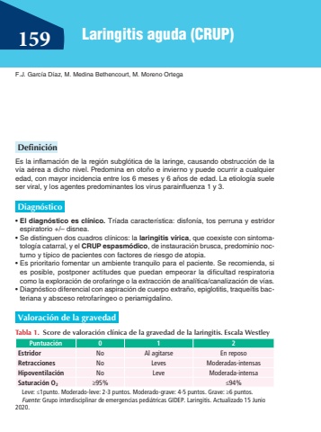 Laringitis aguda (CRUP)159Definici%u00f3nEs la inflamaci%u00f3n de la regi%u00f3n subgl%u00f3tica de la laringe, causando obstrucci%u00f3n de la v%u00eda a%u00e9rea a dicho nivel. Predomina en oto%u00f1o e invierno y puede ocurrir a cualquier edad, con mayor incidencia entre los 6 meses y 6 a%u00f1os de edad. La etiolog%u00eda suele ser viral, y los agentes predominantes los virus parainfluenza 1 y 3. Diagn%u00f3stico%u2022El diagn%u00f3stico es cl%u00ednico. Tr%u00edada caracter%u00edstica: disfon%u00eda, tos perruna y estridor espiratorio +/%u2013 disnea. %u2022Se distinguen dos cuadros cl%u00ednicos: la laringitis v%u00edrica, que coexiste con sintomatolog%u00eda catarral, y el CRUP espasm%u00f3dico, de instauraci%u00f3n brusca, predominio nocturno y t%u00edpico de pacientes con factores de riesgo de atopia.%u2022Es prioritario fomentar un ambiente tranquilo para el paciente. Se recomienda, si es posible, postponer actitudes que puedan empeorar la dificultad respiratoria como la exploraci%u00f3n de orofaringe o la extracci%u00f3n de anal%u00edtica/canalizaci%u00f3n de v%u00edas.%u2022Diagn%u00f3stico diferencial con aspiraci%u00f3n de cuerpo extra%u00f1o, epiglotitis, traque%u00edtis bacteriana y absceso retrofar%u00edngeo o periamigdalino. Valoraci%u00f3n de la gravedadTabla 1.Score de valoraci%u00f3n cl%u00ednica de la gravedad de la laringitis. Escala WestleyPuntuaci%u00f3n012EstridorNoAl agitarseEn reposoRetraccionesNoLevesModeradas-intensasHipoventilaci%u00f3nNoLeveModerada-intensaSaturaci%u00f3n O2%u226595%%u226494%Leve: %u22641punto. Moderado-leve: 2-3 puntos. Moderado-grave: 4-5 puntos. Grave: %u22656 puntos. Fuente: Grupo interdisciplinar de emergencias pedi%u00e1tricas GIDEP. Laringitis. Actualizado 15 Junio 2020.F.J. Garc%u00eda D%u00edaz, M. Medina Bethencourt, M. Moreno Ortega