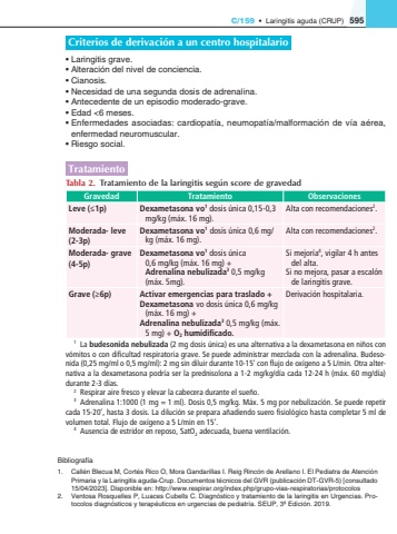 C/159%u2022Laringitis aguda (CRUP)595Criterios de derivaci%u00f3n a un centro hospitalario%u2022Laringitis grave.%u2022Alteraci%u00f3n del nivel de conciencia.%u2022Cianosis.%u2022Necesidad de una segunda dosis de adrenalina.%u2022Antecedente de un episodio moderado-grave.%u2022Edad <6 meses.%u2022Enfermedades asociadas: cardiopat%u00eda, neumopat%u00eda/malformaci%u00f3n de v%u00eda a%u00e9rea, enfermedad neuromuscular.%u2022Riesgo social.TratamientoTabla 2.Tratamiento de la laringitis seg%u00fan score de gravedadGravedadTratamientoObservacionesLeve (%u22641p)Dexametasona vo1 dosis %u00fanica 0,15-0,3 mg/kg (m%u00e1x. 16 mg).Alta con recomendaciones2.Moderada- leve (2-3p)Dexametasona vo1dosis %u00fanica 0,6 mg/kg (m%u00e1x. 16 mg).Alta con recomendaciones2.Moderada- grave (4-5p)Dexametasona vo1 dosis %u00fanica 0,6 mg/kg (m%u00e1x. 16 mg) + Adrenalina nebulizada3 0,5 mg/kg (m%u00e1x. 5mg).Si mejor%u00eda4, vigilar 4 h antes del alta.Si no mejora, pasar a escal%u00f3n de laringitis grave.Grave (%u22656p)Activar emergencias para traslado +Dexametasonavo dosis %u00fanica 0,6 mg/kg (m%u00e1x. 16 mg) +Adrenalina nebulizada30,5 mg/kg (m%u00e1x. 5 mg) + O2 humidificado.Derivaci%u00f3n hospitalaria.1La budesonida nebulizada (2 mg dosis %u00fanica) es una alternativa a la dexametasona en ni%u00f1os con v%u00f3mitos o con dificultad respiratoria grave. Se puede administrar mezclada con la adrenalina. Budesonida (0,25 mg/ml o 0,5 mg/ml): 2 mg sin diluir durante 10-15%u2019 con flujo de ox%u00edgeno a 5 L/min. Otra alternativa a la dexametasona podr%u00eda ser la prednisolona a 1-2 mg/kg/d%u00eda cada 12-24 h (m%u00e1x. 60 mg/d%u00eda) durante 2-3 d%u00edas.2Respirar aire fresco y elevar la cabecera durante el sue%u00f1o.3Adrenalina 1:1000 (1 mg = 1 ml). Dosis 0,5 mg/kg. M%u00e1x. 5 mg por nebulizaci%u00f3n. Se puede repetir cada 15-20%u2019, hasta 3 dosis. La diluci%u00f3n se prepara a%u00f1adiendo suero fisiol%u00f3gico hasta completar 5 ml de volumen total. Flujo de ox%u00edgeno a 5 L/min en 15%u2019.4Ausencia de estridor en reposo, SatO2 adecuada, buena ventilaci%u00f3n.Bibliograf%u00eda1.Call%u00e9n Blecua M, Cort%u00e9s Rico O, Mora Gandarillas I. Reig Rinc%u00f3n de Arellano I. El Pediatra de Atenci%u00f3n Primaria y la Laringitis aguda-Crup. Documentos t%u00e9cnicos del GVR (publicaci%u00f3n DT-GVR-5) [consultado 15/04/2023]. Disponible en: http://www.respirar.org/index.php/grupo-vias-respiratorias/protocolos2.Ventosa Rosquelles P, Luaces Cubells C. Diagn%u00f3stico y tratamiento de la laringitis en Urgencias. Protocolos diagn%u00f3sticos y terap%u00e9uticos en urgencias de pediatr%u00eda. SEUP, 3%u00aa Edici%u00f3n. 2019.
