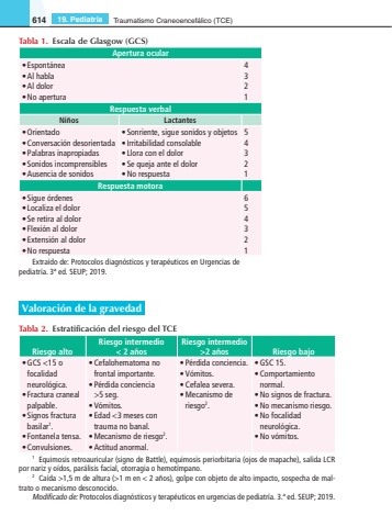 61419. Pediatr%u00edaTraumatismo Craneoencef%u00e1lico (TCE)Valoraci%u00f3n de la gravedadApertura ocular%u2022Espont%u00e1nea%u2022Al habla%u2022Al dolor%u2022No apertura 4321Respuesta verbalNi%u00f1os Lactantes %u2022Orientado%u2022Conversaci%u00f3n desorientada%u2022Palabras inapropiadas%u2022Sonidos incomprensibles%u2022Ausencia de sonidos%u2022Sonriente, sigue sonidos y objetos%u2022Irritabilidad consolable%u2022Llora con el dolor%u2022Se queja ante el dolor%u2022No respuesta54321Respuesta motora%u2022Sigue %u00f3rdenes%u2022Localiza el dolor%u2022Se retira al dolor%u2022Flexi%u00f3n al dolor%u2022Extensi%u00f3n al dolor%u2022No respuesta 654321Tabla 1.Escala de Glasgow (GCS)Extra%u00eddo de: Protocolos diagn%u00f3sticos y terap%u00e9uticos en Urgencias de pediatr%u00eda. 3%u00aa ed. SEUP; 2019.Riesgo altoRiesgo intermedio < 2 a%u00f1osRiesgo intermedio >2 a%u00f1osRiesgo bajo%u2022GCS <15 o focalidad neurol%u00f3gica.%u2022Fractura craneal palpable.%u2022Signos fractura basilar1.%u2022Fontanela tensa.%u2022Convulsiones.%u2022Cefalohematoma no frontal importante.%u2022P%u00e9rdida conciencia >5 seg.%u2022V%u00f3mitos.%u2022Edad <3 meses con trauma no banal.%u2022Mecanismo de riesgo2.%u2022Actitud anormal.%u2022P%u00e9rdida conciencia.%u2022V%u00f3mitos.%u2022Cefalea severa.%u2022Mecanismo de riesgo2.%u2022GSC 15.%u2022Comportamiento normal.%u2022No signos de fractura.%u2022No mecanismo riesgo.%u2022No focalidad neurol%u00f3gica.%u2022No v%u00f3mitos.Tabla 2.Estratificaci%u00f3n del riesgo del TCE1Equimosis retroauricular (signo de Battle), equimosis periorbitaria (ojos de mapache), salida LCR por nariz y o%u00eddos, par%u00e1lisis facial, otorragia o hemot%u00edmpano.2Ca%u00edda >1,5 m de altura (>1 m en < 2 a%u00f1os), golpe con objeto de alto impacto, sospecha de maltrato o mecanismo desconocido.Modificado de: Protocolos diagn%u00f3sticos y terap%u00e9uticos en urgencias de pediatr%u00eda. 3.%u00aa ed. SEUP; 2019.