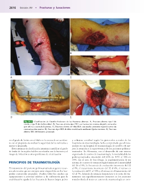 contaminación masiva. D, Fractura tipo IIIB de tibia estabilizada mediante fijador externo. E, Fractura