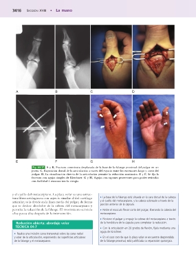 pulgar. D, La visualización directa de la articulación permite la reducción anatómica. E y F, Se fija la
