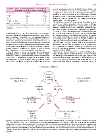 Figura 26-1. Esquema del metabolismo del hierro. La cifra superior en cada posición es un promedio para un adulto de 80 kg; la cifra de más abajo es para una mujer de