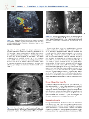sisten, predominantemente, en hígado e intestino colapsado y, tro de la masa (Fig. 9-13B), tanto con escala de grises como con
