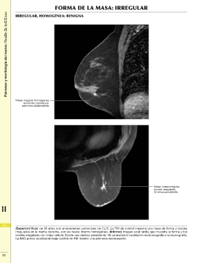 irregulares en la mama derecha, con un realce interno homogéneo. (Inferior) Imagen axial tardía que muestra la forma y los