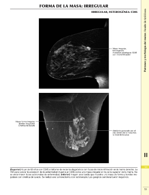se encontraron focos adicionales de enfermedad. (Inferior) Imagen axial tardía que muestra una masa de forma y bordes irre- 2