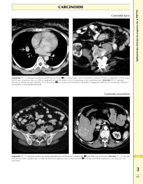 (Izquierda) TC + C axial que muestra un nódulo parcialmente calcificado en el mesenterio , que indica un carcinoide. (Derecha) TC + C axial que 419