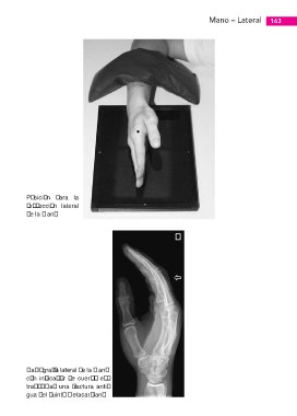 Mano – Lateral 163 Posición para la proyección lateral de la mano D Radiografía lateral de la mano con indicador de cuerpo ex- traño. Hay una fractura anti- gua del quinto metacarpiano