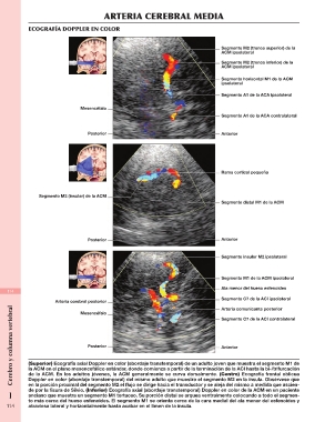 (Superior) Ecografía axial Doppler en color (abordaje transtemporal) de un adulto joven que muestra el segmento M1 de