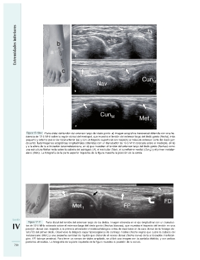 Figura 17–10a-c Parte distal del tendón del extensor largo del dedo gordo. a) Imagen ecográfica transversal obtenida con una fre-